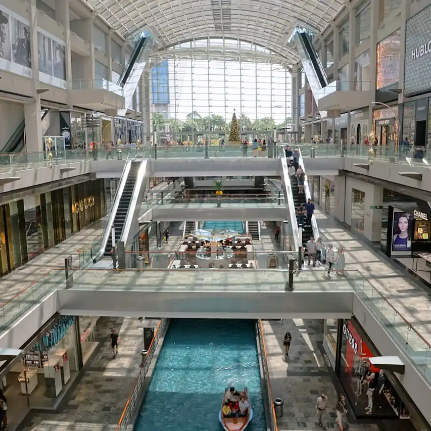 El lujoso hotel cuenta con un espectacular centro comercial que alberga muchas tiendas exclusivas. Además, tiene su propio canal, donde podrás pasear en barca, áreas interactivas para los más pequeños, y un food court.