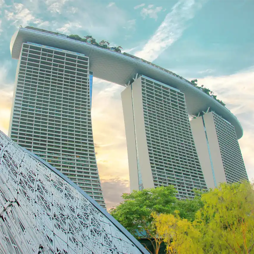 Se ha convertido en otro de los símbolos de la ciudad de Singapur, probablemente debido a su inmensa piscina infinita que se alza sobre sus tres impresionantes torres. Puedes acceder a la cima del Marina Bay Sands pagando la entrada; eso sí, tu visita será únicamente para admirar las vistas, ya que bañarte en la piscina no será posible a menos que te alojes en el hotel (spoiler: es muy caro).